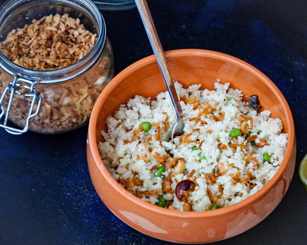 Add the cauliflower next to the oil along with the peas. Add the cooked rice to the pan. Fry them together and cover it with a lid on low flame for 8-10 minutes. The cauliflower rice should be cooked by now and should have a couscous like texture. Season it with salt, pepper and some chilli powder if you like it spicy.